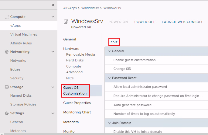 Теперь узнаем пароль администратора в нашей гостевой ОС. Для этого перейдём в раздел Virtual Machines, найдём нашу виртуальную машину и нажмём на ней Details. Переходим в раздел Guest OS Customization и нажимаем справа кнопку EDIT