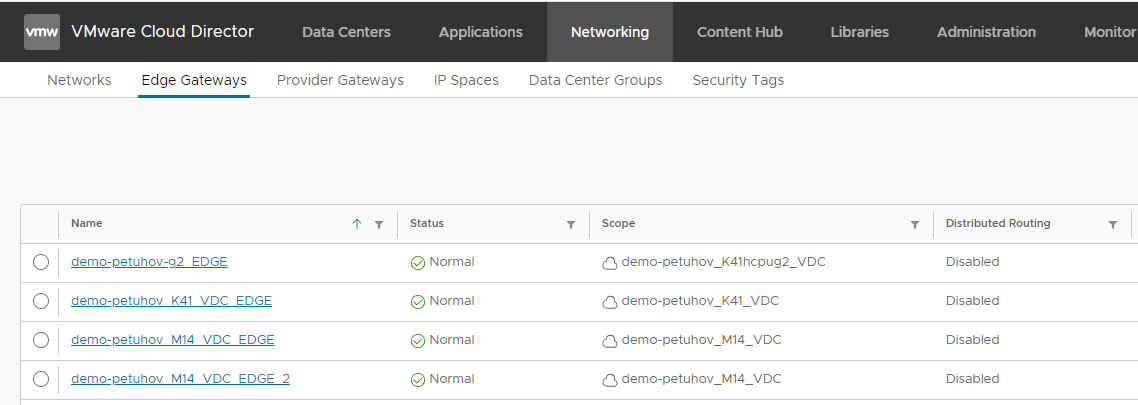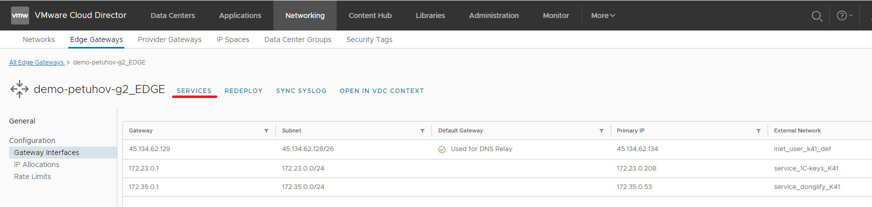 В первую очередь необходимо убедиться, что к EDGE подключена сервисная сеть service_donglify_K41 или service_donglify_M14. Для этого в разделе Networking, подразделе Edge – необходимо выбрать ваш EDGE нажав на него.