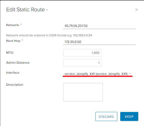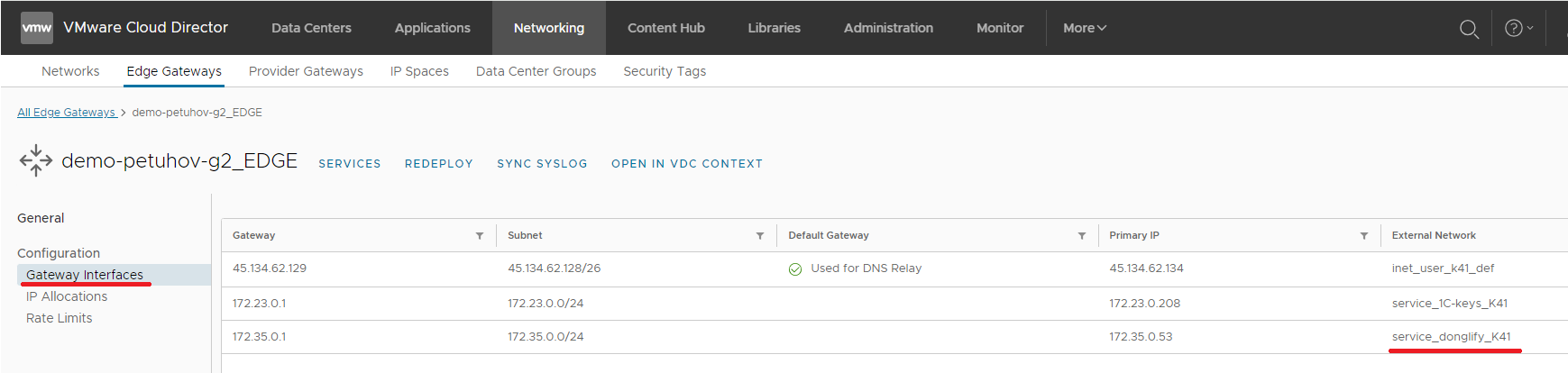 В открывшемся окне в левой части необходимо выбрать Gateway Interfaces, и в столбце “External Network” найти сеть с названием service_donglify_K41 или service_donglify_M14. Если такая сеть не подключена – то необходимо обратиться в техподдержку чтобы вам подключили одну из этих сетей.