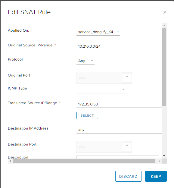 Translated Source IP/Range – нажимаем кнопку select, выбираем сервисную сеть, и ip-адрес который выдан из этой сети.