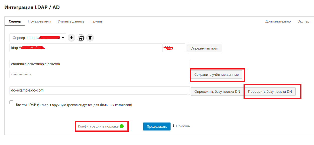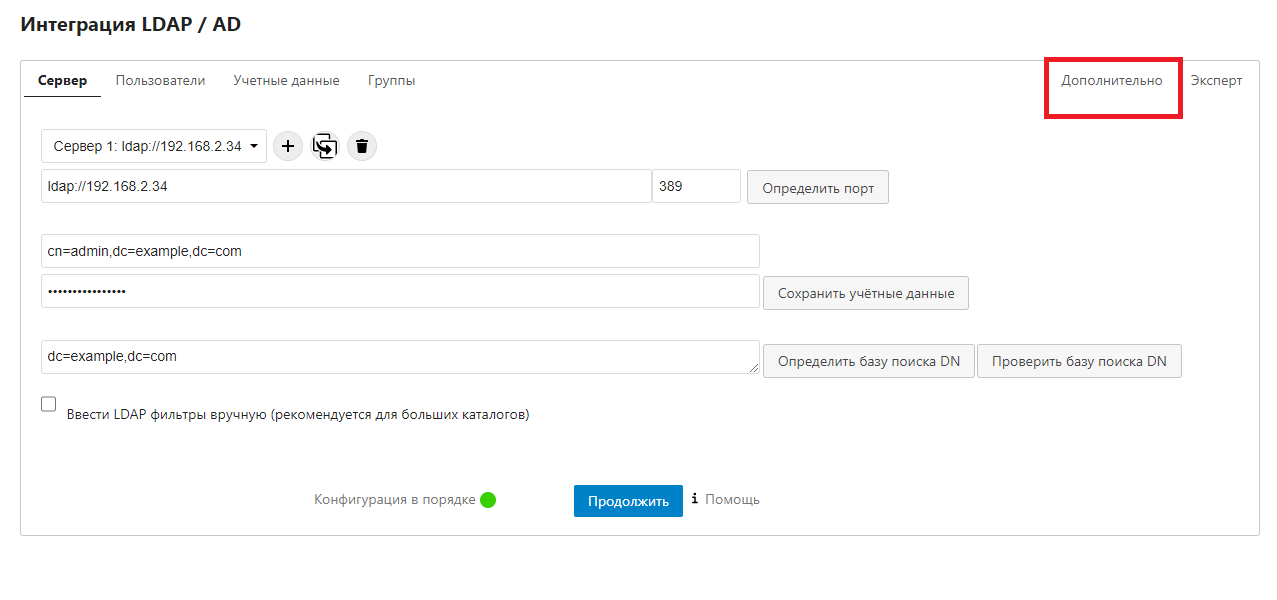 Должна появиться надпись Конфигурация в порядке, означающая, что всё настроено правильно и связь с сервером LDAP есть.