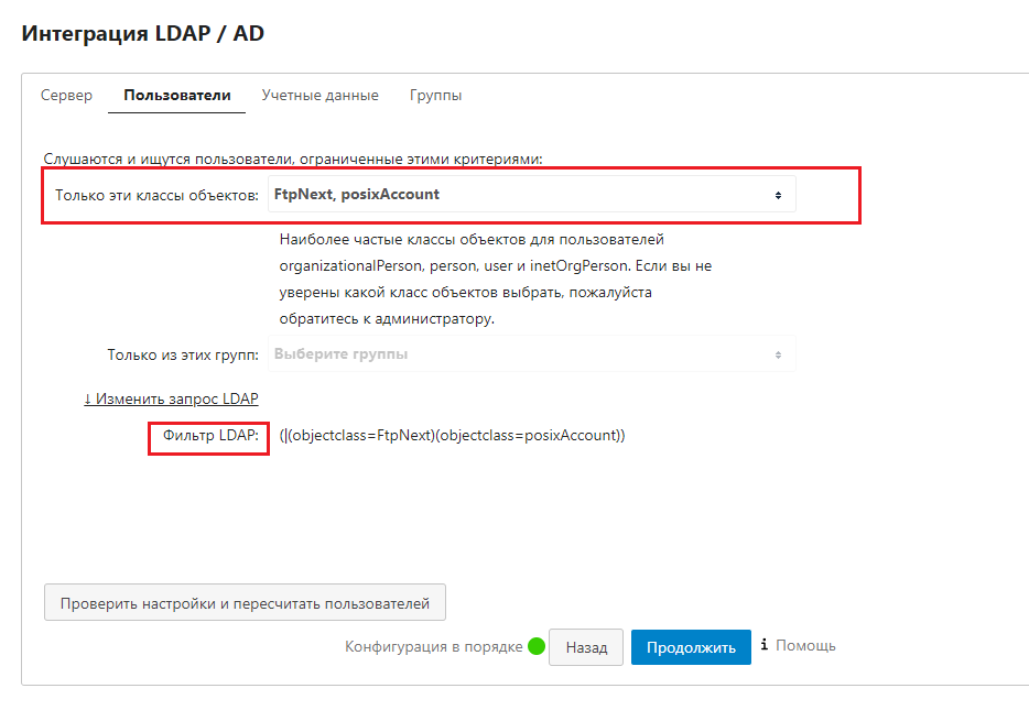 Выбираем указанные ниже фильтры для выборки пользователей, которые имеют объектные классы posixAccount и FtpNext, т.е. принадлежат Nextcloud. Нажимаем Продолжить.