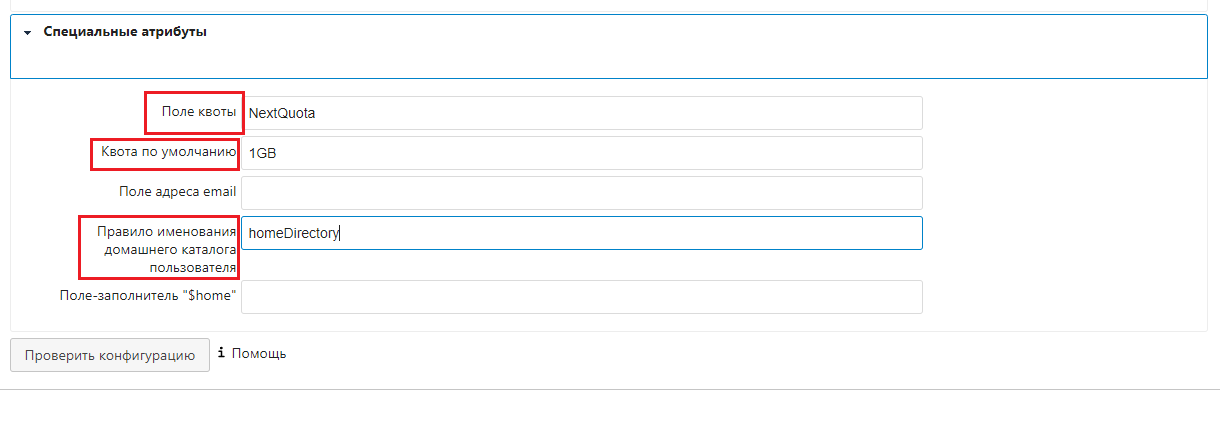 Вводим в поле квоты атрибут из LDAP, который отвечает за квоту в Nextcloud, созданный нами ранее. Вводим квоту по умолчанию, если поля квота не обнаружится. Правило наименования домашнего каталога также берём из LDAP атрибута homeDirectory (т.к. наименование домашних каталогов пользователей в Nextcloud по умолчанию некрасивое).