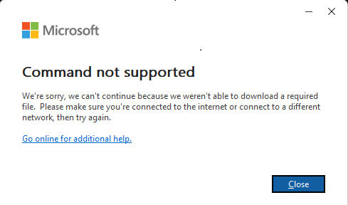 We’re sorry, we can’t continue because we weren’t able to download a required file. Please make sure you’re connected to the internet or connect to a different network, then try again